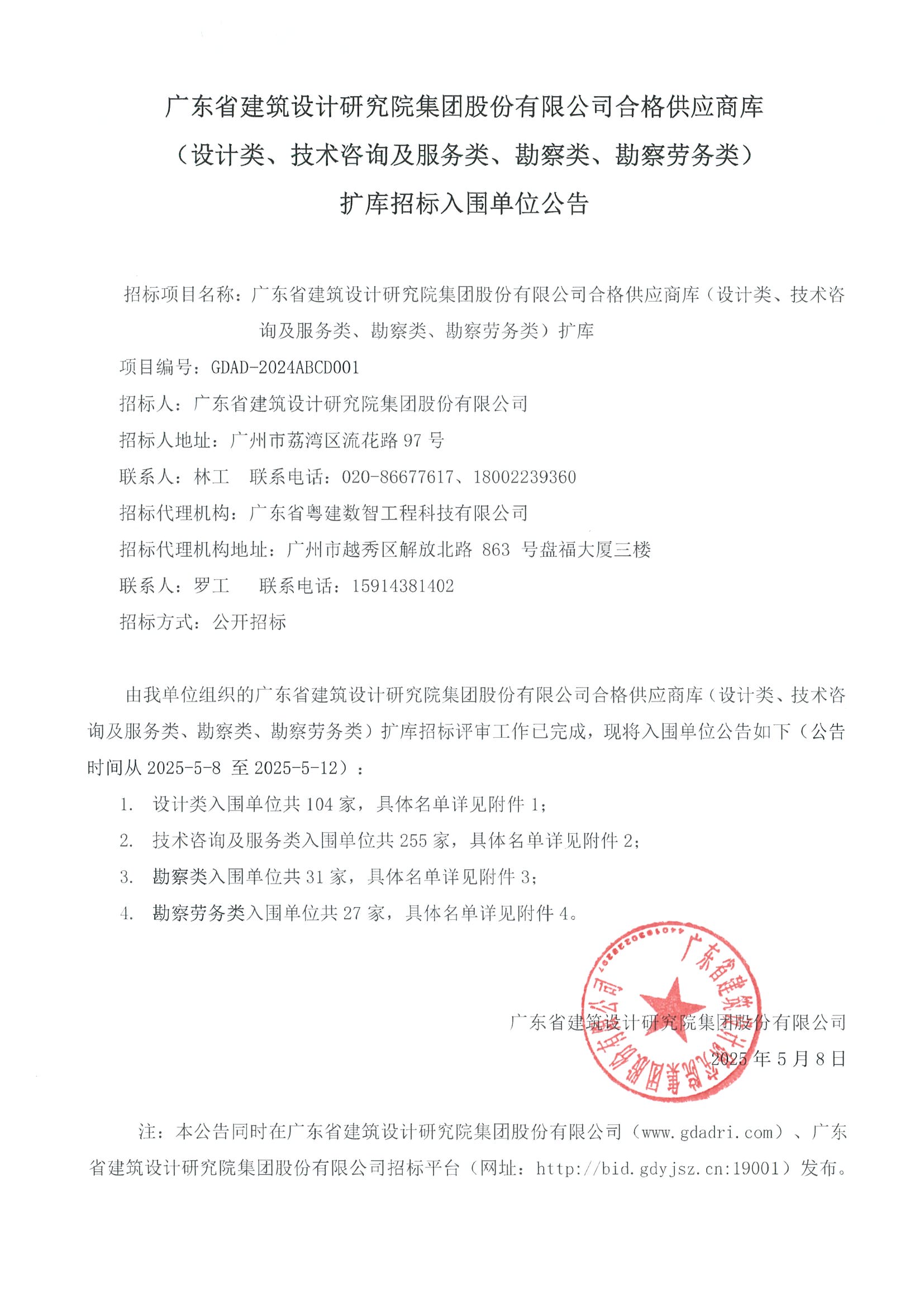 廣東省建筑設(shè)計研究院集團股份有限公司合格供應(yīng)商庫(設(shè)計類、技術(shù)咨詢及服務(wù)類、勘察類、勘察勞務(wù)類)擴庫招標入圍單位公告