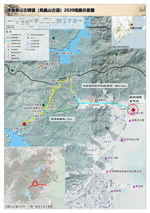 2020年香山古道(珠海鳳凰山段)列入南粵古驛道新增重點線路,年度約束性任務(wù)包括古道本體修復(fù)、連接線建設(shè)、古橋遺存修復(fù)、古驛道標(biāo)識設(shè)施安裝、沿線休息觀景節(jié)點提升等,現(xiàn)正在重點推進(jìn)鳳凰山段一期建設(shè),通過修復(fù)5公里古道本體,以及建設(shè)8.5公里懸空平臺、空中棧道、吊索浮橋等多種形式的古驛道山地連接線,并結(jié)合紅花山森林公園建設(shè),串聯(lián)起沿線歷史文化資源點、公共游憩空間、旅游景點及美麗鄉(xiāng)村,打造鳳凰山歷史文化游徑,構(gòu)建鳳凰山休閑步道,形成珠海山海觀光帶,成為珠海“山、海、城”休閑慢行網(wǎng)絡(luò)體系重要一環(huán)。